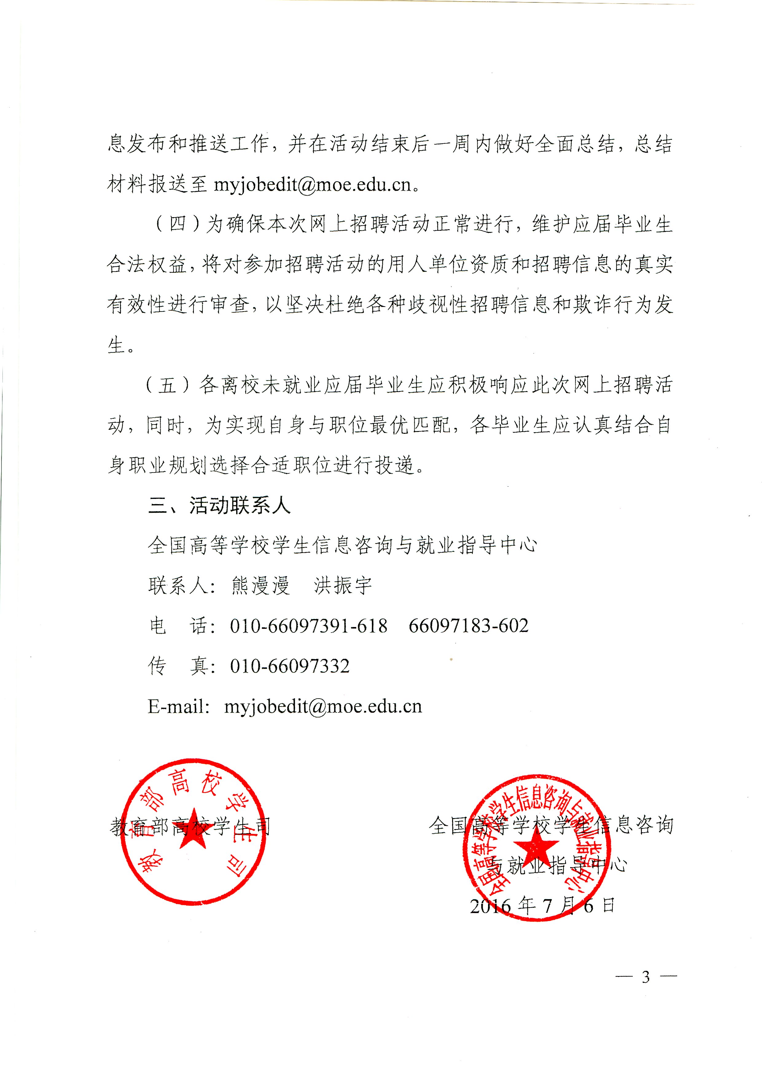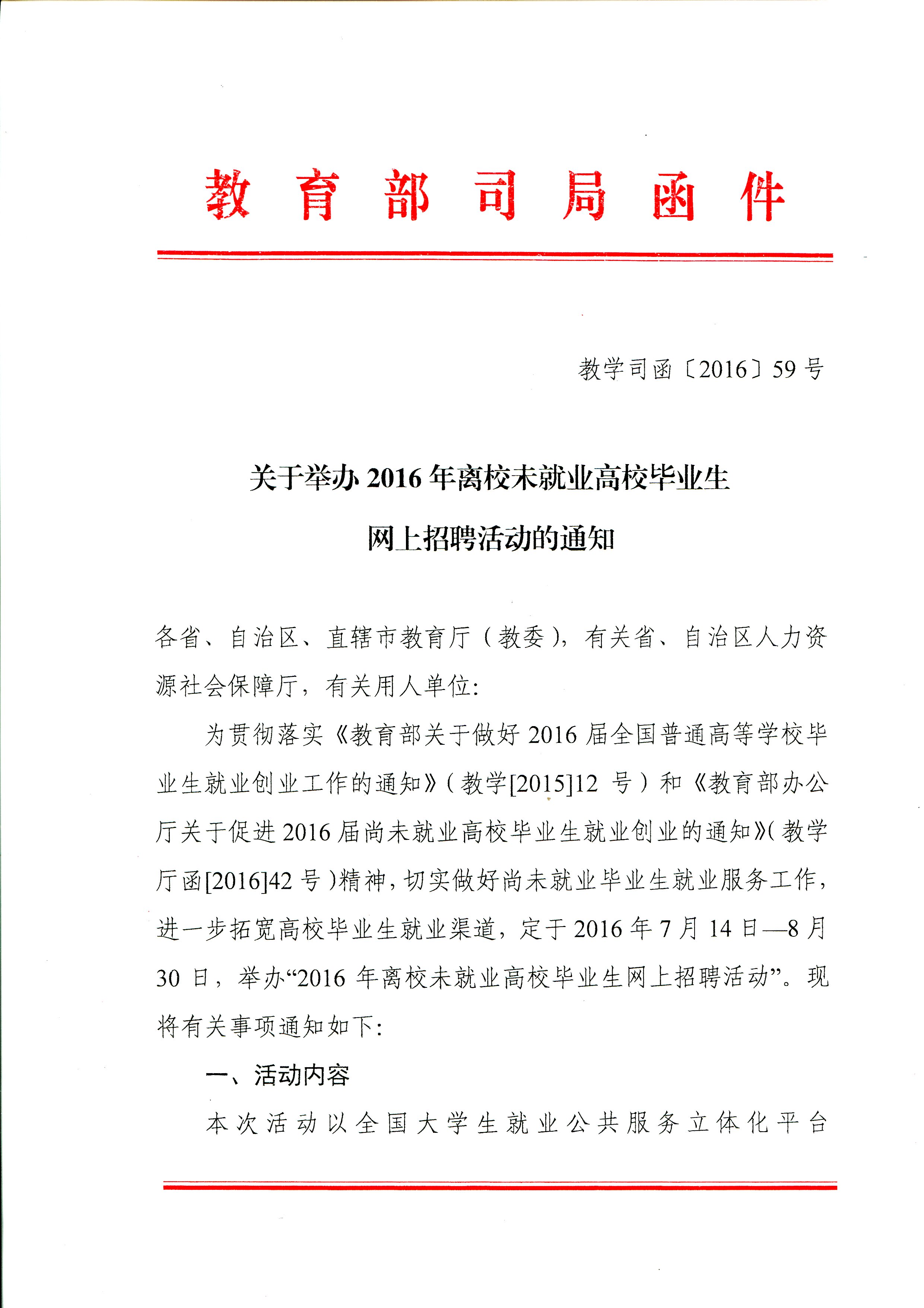 教学司函【2016】59号 2016年离校未就业高校毕业生网上招聘活动的通知