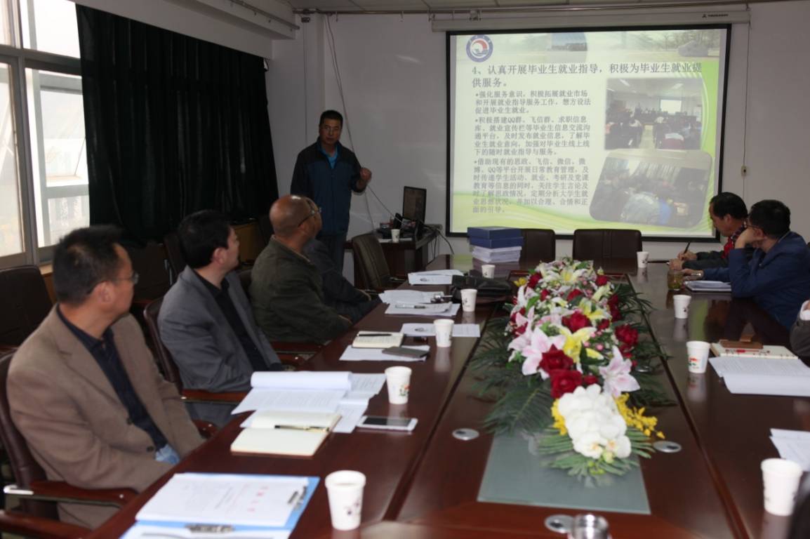 校学生工作处杨文宏副处长首先对此次考核的要求和程序做了说明。随后,院学生管理部就业指导科科长吴海庆从学院2016届毕业生基本情况、就业创业工作完成情况与具体做法、存在的问题与原因分析、自查比对与找出差距以及2017年就业创业工作思路与建议等方面进行了汇报。李宗仁院长和王永杰书记就此还作了相关补充说明与问题探讨。