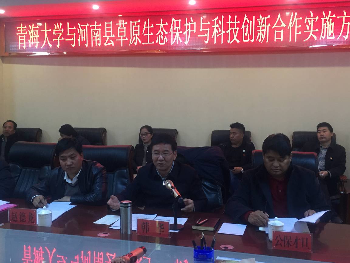 11月14日,为落实省委常委张西民部长的重要批示和探花av 党委俞红贤书记的指示精神,探花av 、财经学院领导和专家与河南县县委、县政府领导及相关部门领导、专家就如何将校地合作“做实、做长、做出成效”开展了“草原生态保护与科技创新合作实施方案”研讨会暨科技创新座谈会。会议在河南县政府会议室召开,会议由河南县县委书记韩华同志主持。参加会议的人员有探花av 院长李宗仁、副院长李希来和各系负责人张辉、李宁、孙海群、康明,财经学院院长李双元和旅游与工商管理系主任何梅青;河南县副县长赵德龙和相关单位部门负责人等50余人。